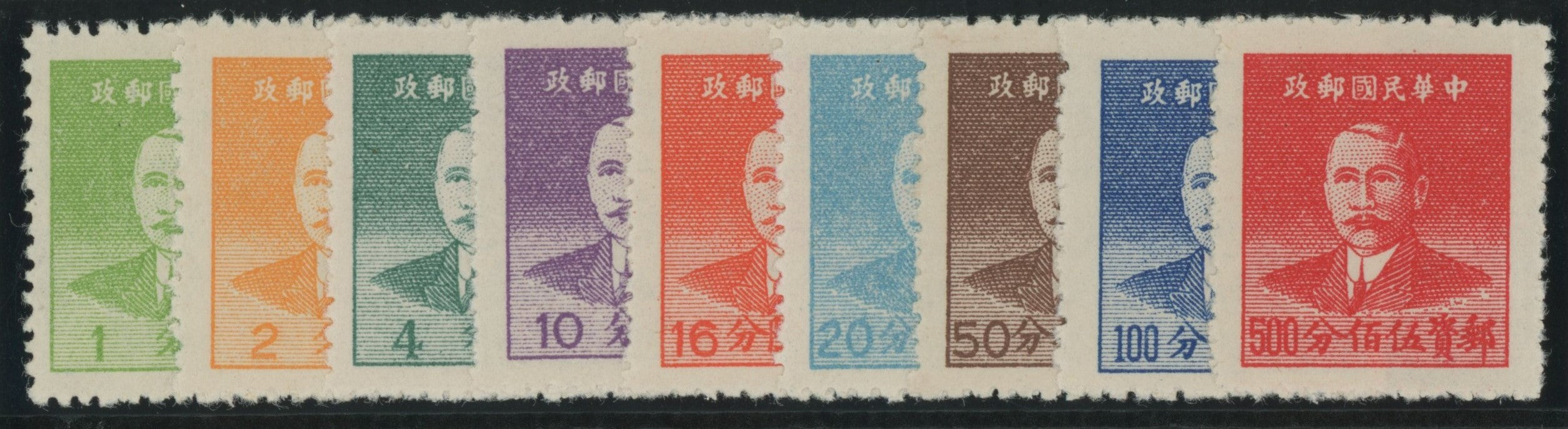 China 1949 Sun Yat-sen (14th issue), Hwa Nam printing, silver yuan set of 9 to 500c scarlet, SG1348/56.