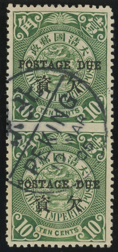 China 1904 (16 Mar) 10c deep green vertical pair, with error IMPERFORATE BETWEEN, Postage Due error, SGD142a.
