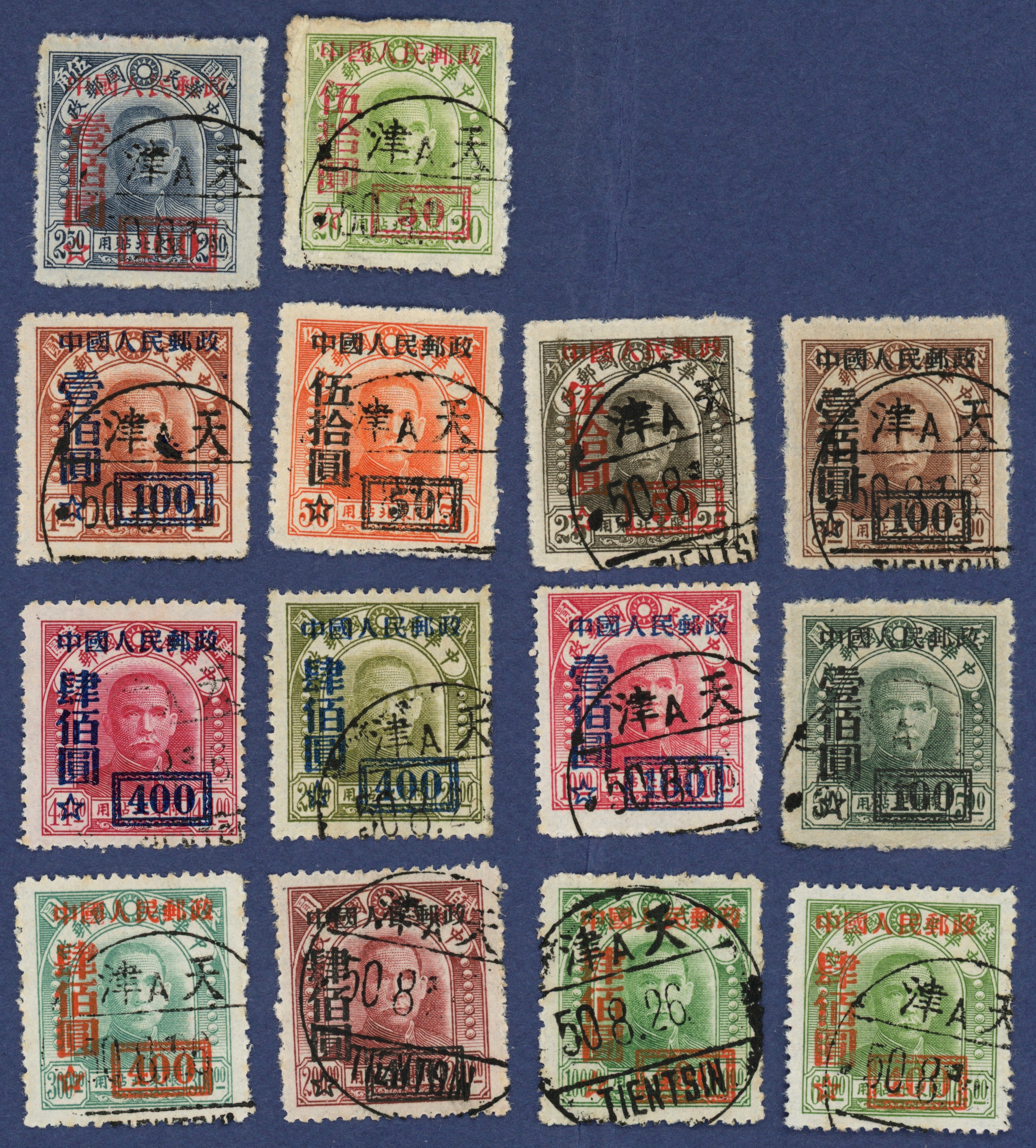 China 1950 (July) People's Republic of China General Issues 1950 surcharges on Sun Yat-sen North Eastern Provinces issue, basic set of 14 to $400 on $300, excluding SG1440a, SG1442a and SG1443a, SG1436/49ex.