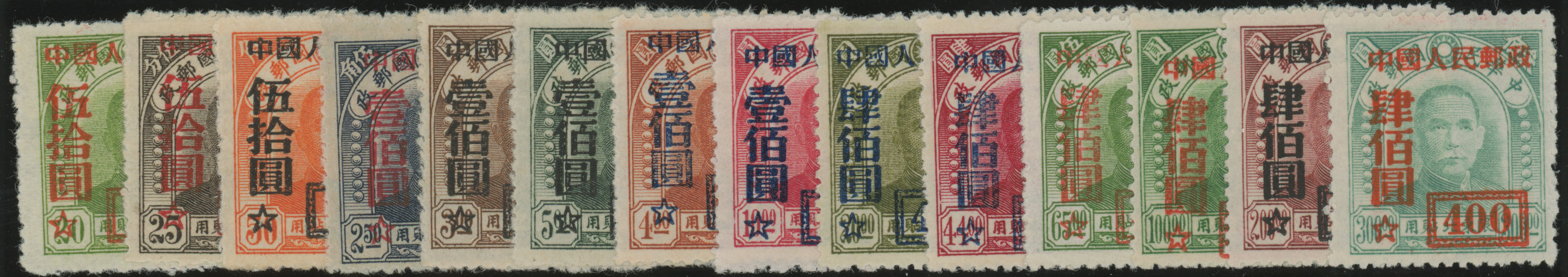 China 1950 (July) People's Republic China general issues surcharges on North Eastern Provinces Sun Yat-sen set of 14 to $400 on $300 blue-green (excluding original printings $100 on $4 and $400 on $20), SG1436/49btn.