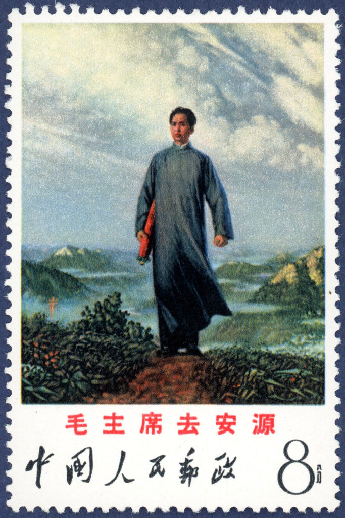The stamp features a painting by Chinese artist Liu Chunhua, which portrays Chairman Mao as a young man on his way to Anyuan, a small town in Jiangxi province where he worked as a labour organiser in the early 1920s. Mao's work in Anyuan was a crucial period in his life and set the foundation for his later political beliefs and actions.