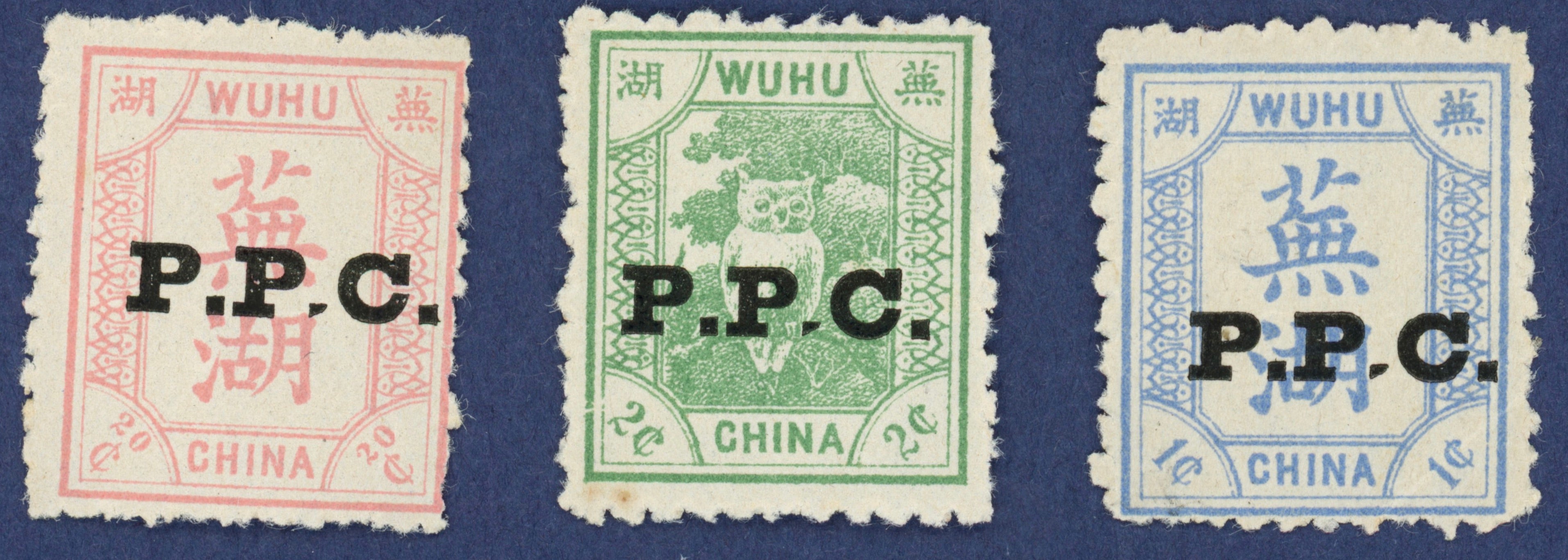 China 1897 Wuhu Local Post P.P.C. black overprint on 1895 issue, 1c dull blue, 2c green and 20c pink, each showing constant printing variety 'bisected stop after second P', SG78/9,84var.