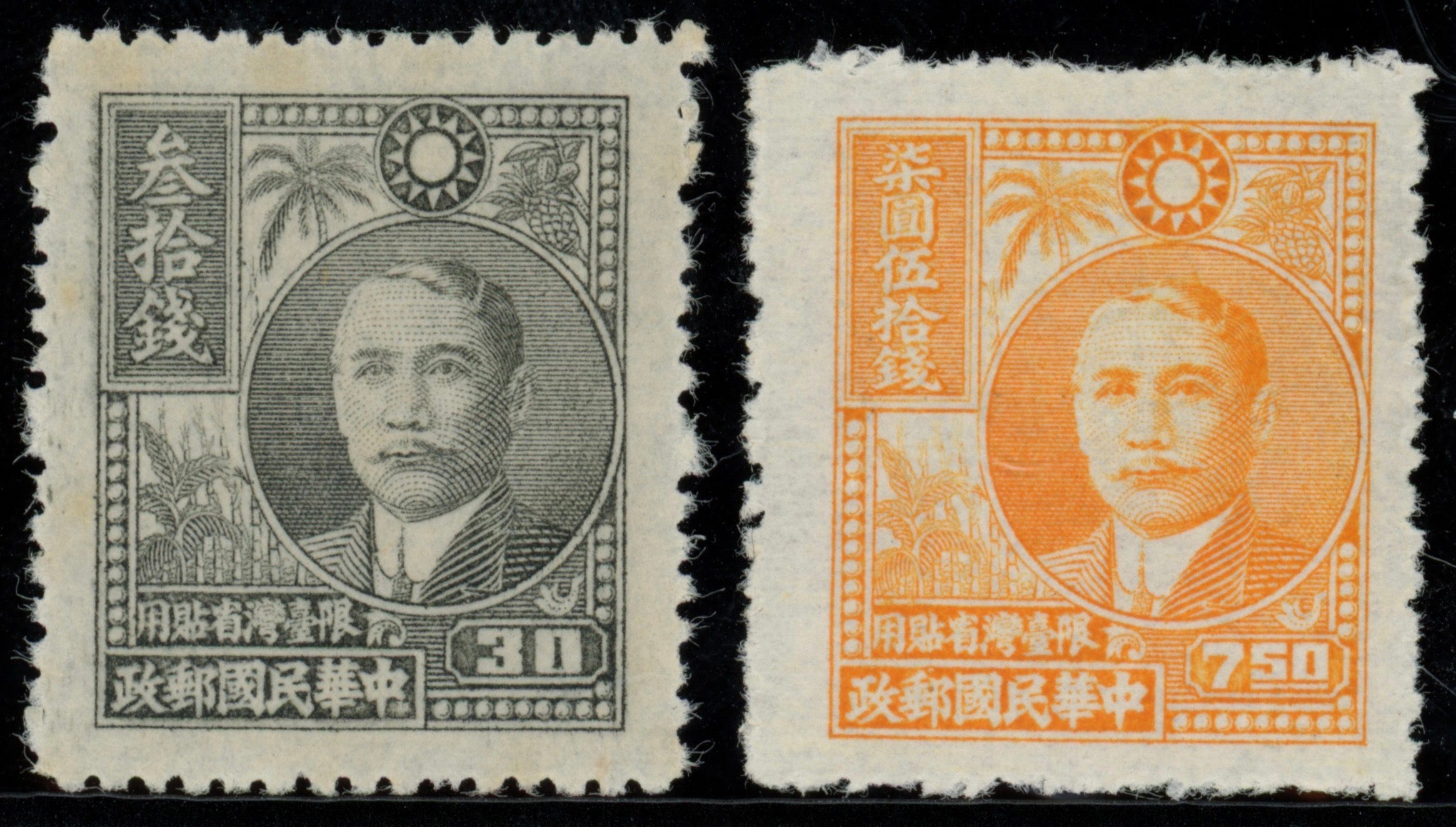 China Taiwan 1947 Sun Yat-sen 'Palm trees', 30c grey and $7 50 orange, prepared for use but not issued, without surcharge.