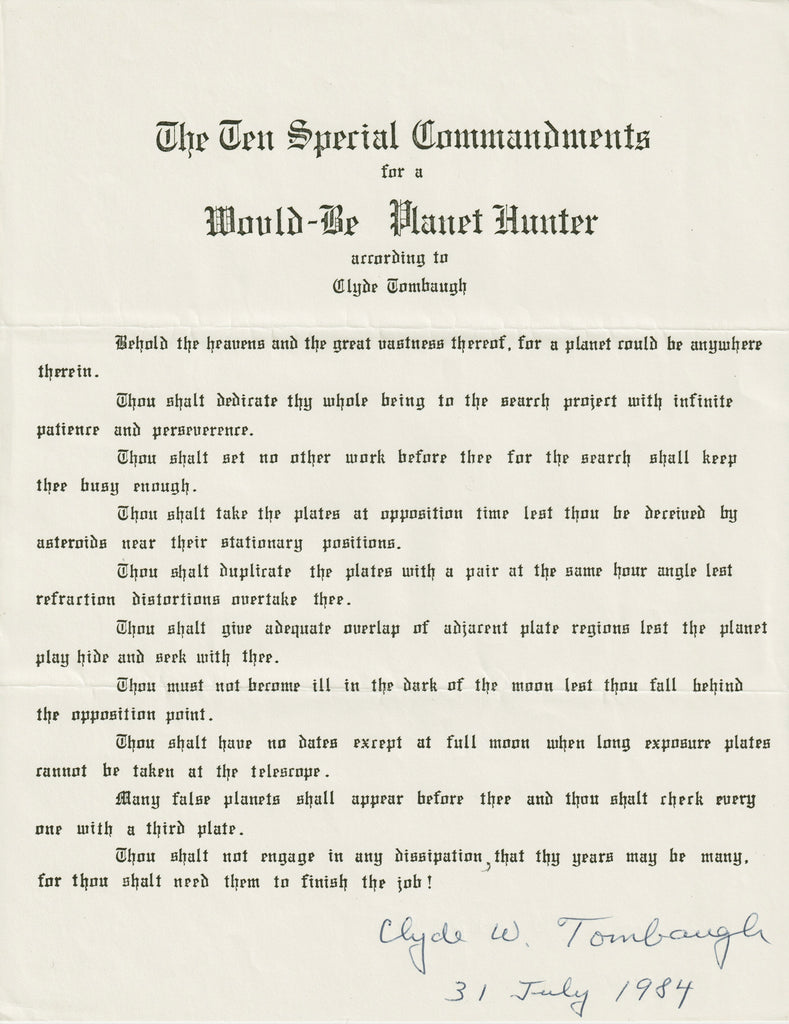 - A signed copy of Clyde Tombaugh's Ten Special Commandments for a Would-Be Planet Hunter