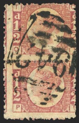 Cyprus 1878-80 Great Britain ½1/2d rose-red, plate 13, vertical pair (OT/PT), sharing complete '942' of Larnaca, SGZ14.