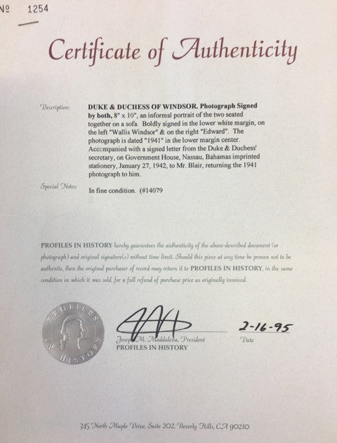 The piece is accompanied by an impressive collection of provenance, including the original letter from the Windsors' secretary to the recipient of the photograph and a certificate of authenticity from LA auction house Profiles in History – which handled the original sale.