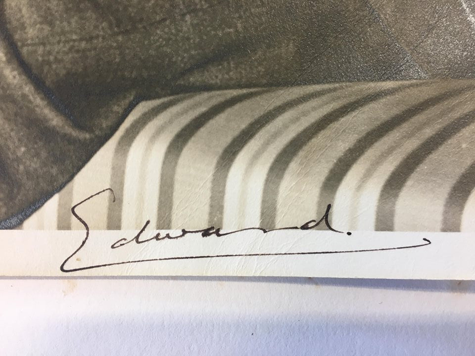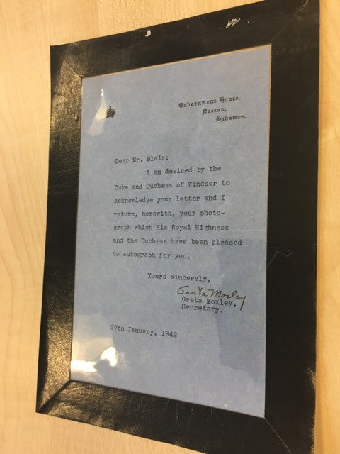 Edward VIII and Wallis Simpson, Duke and Duchess of Windsor, have signed at the bottom of this large black and white photograph. It’s dated 1941, when the couple were installed in Nassau in the Bahamas. Edward was assigned the position of governor on the island during the second world war.