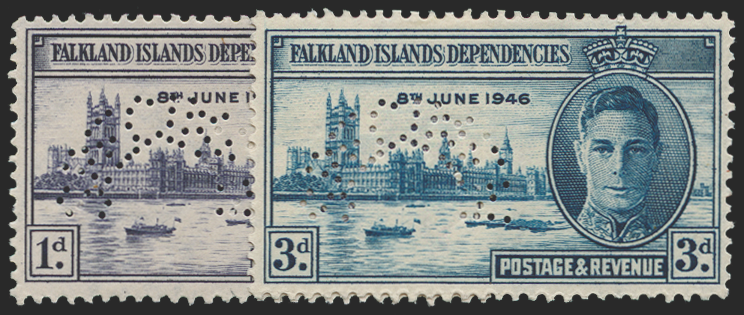 Falkland Islands Dependencies 1946 Victory 1d deep violet and 3d blue, perforated 'SPECIMEN' (type D21), SG17s/18s.