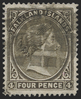 Falkland Islands 1885-91 4d pale grey-black, watermark CA sideways (to right from back and REVERSED), used with light large part '6x4' cork cancel (Barnes 1/86), SG9y.