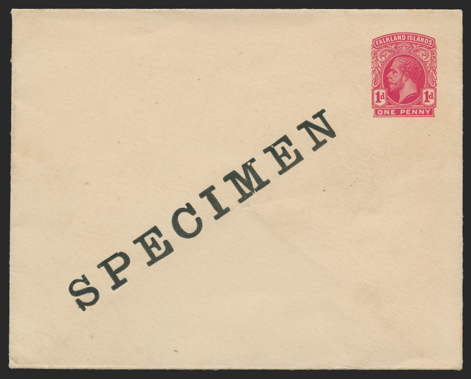 Falkland Islands 1917 1d carmine postal stationery envelope, overprinted 'SPECIMEN'.