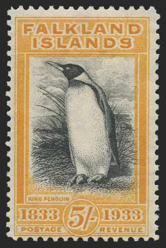 Falkland Islands 1933 Centenary 5s black and yellow-orange 'King Penguin', SG136a.