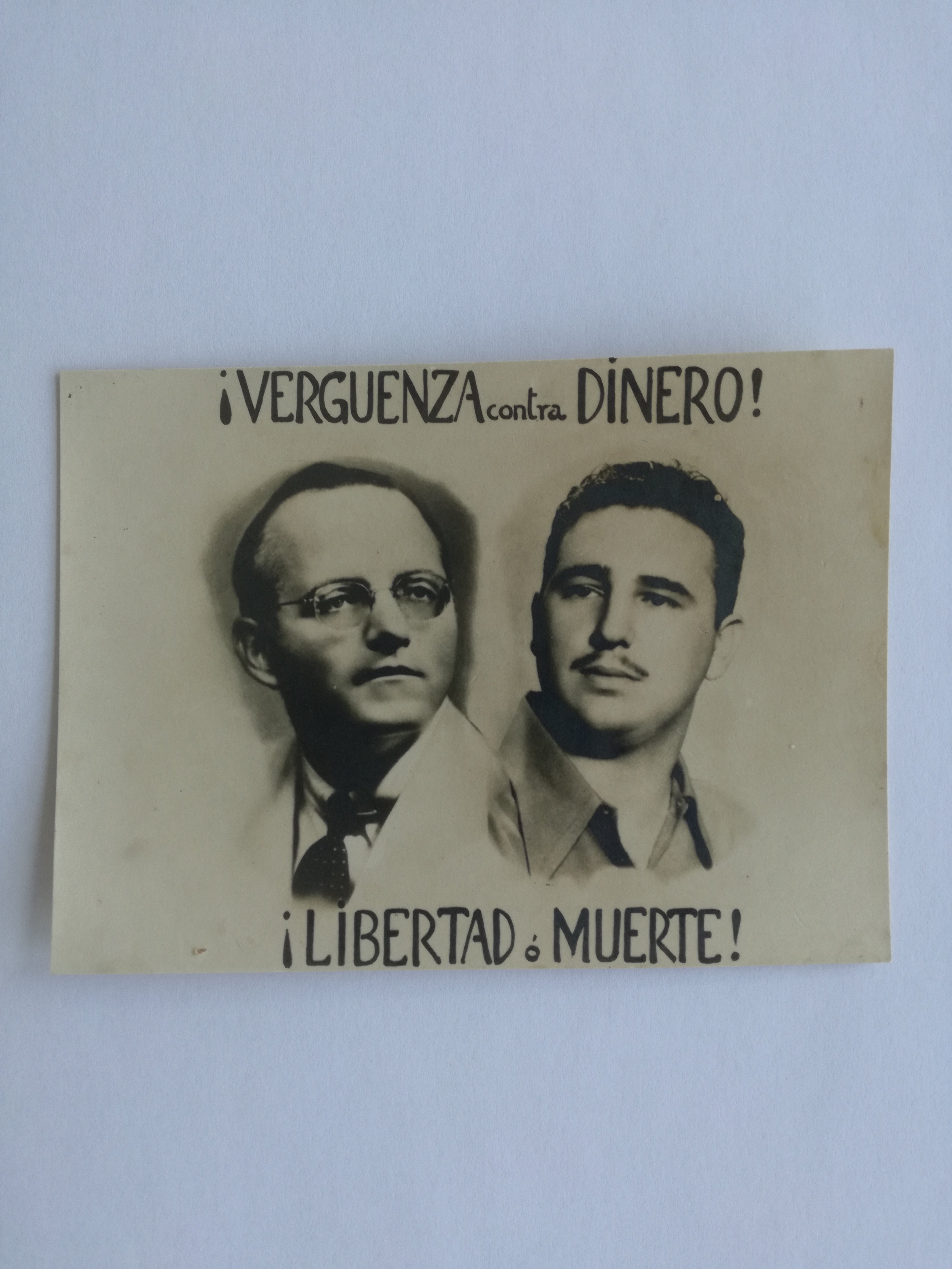 It is accompanied by a card bearing the photos of Fidel Castro and Cuban politician Eduardo Chibas. It reads: "Verguenza contra Dinero!/Shame against Money", and "Libertad o Muerte/Freedom or Death".