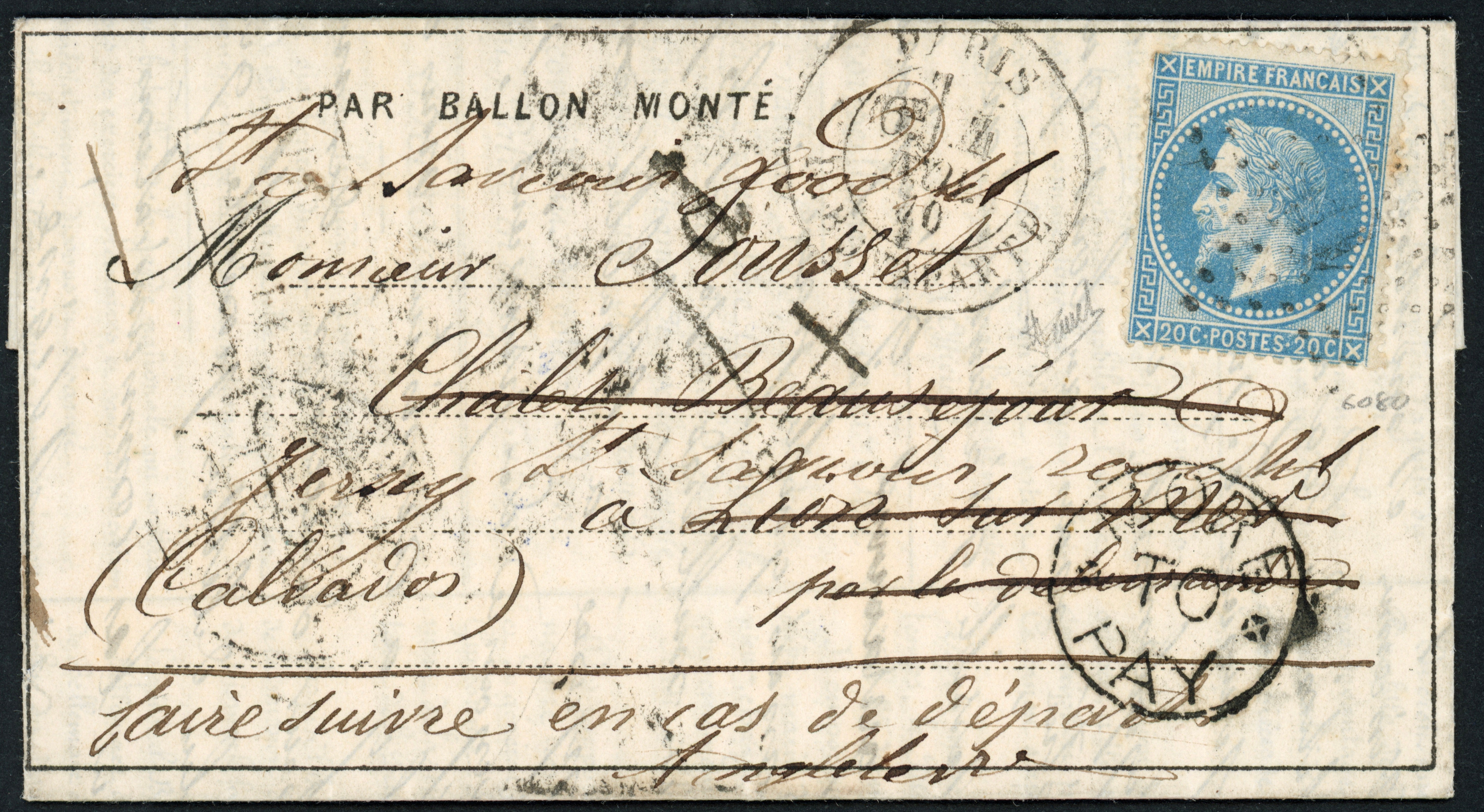 France Twenty-fifth Balloon of the Siege: 1870 printed Ballon Monte lettersheet sent to Calvados and re-addressed to St. Saviour Jersey, franked by Napoleon III 20c (underpaying the 30c overseas rate) lightly tied by Star mark with Paris Rue Bonaparte circular date stamp for ‘4 NOV’.