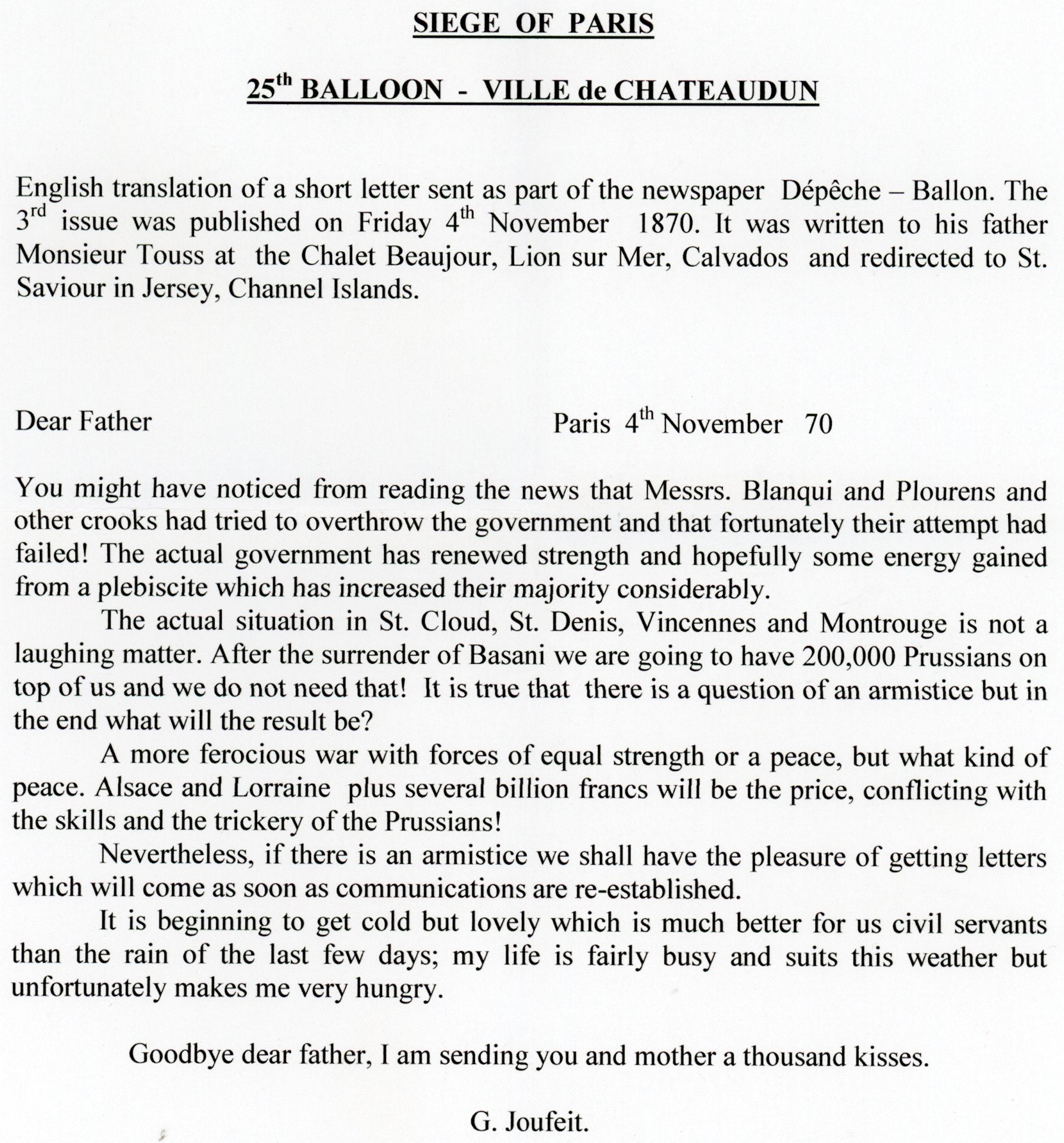 The letter was sent by G Joufeit as part of the newspaper Dépêche-Ballon. The 3rd issue was published on Friday 4th November 1870. It was written to his father Monsieur Touss at the Chalet Beaujour, Lion sur Mer, Calvados and redirected to St. Saviour in Jersey, Channel Islands. The letter contains interesting historical content referring to a failed attempt to overthrow the government in Paris and the expected impact of the Franco-Prussian War.