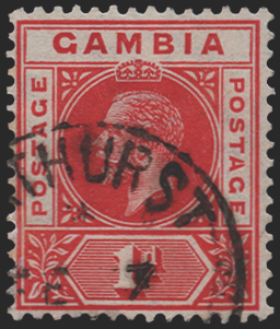 Gambia 1912-22 1d red, Watermark MCA, variety "Split A" from left pane, R8/3, SG87c.
