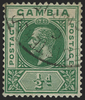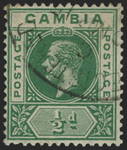 Gambia 1912-22 ½d green, Watermark MCA, variety "Split A" from left pane, R8/3, lightly cancelled by part registered oval dated "(?)0 MR 15", SG86c.