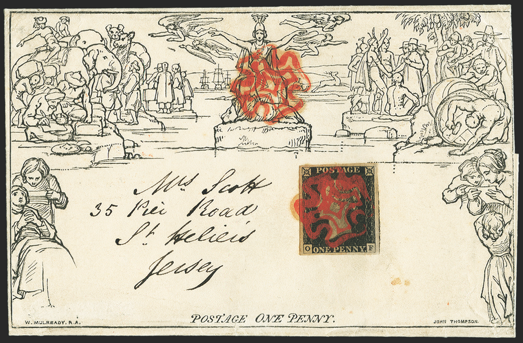 Superb used example uprated to the 2d per 1 ounce rate with an additional four margin 1d black Plate 2, both beautifully cancelled by crisp red Maltese Crosses. Sent from Stourbridge to St. Helier, Jersey back stamped with Stourbridge and London circular date stamps on reverse for JU.14 & 15.1840.
