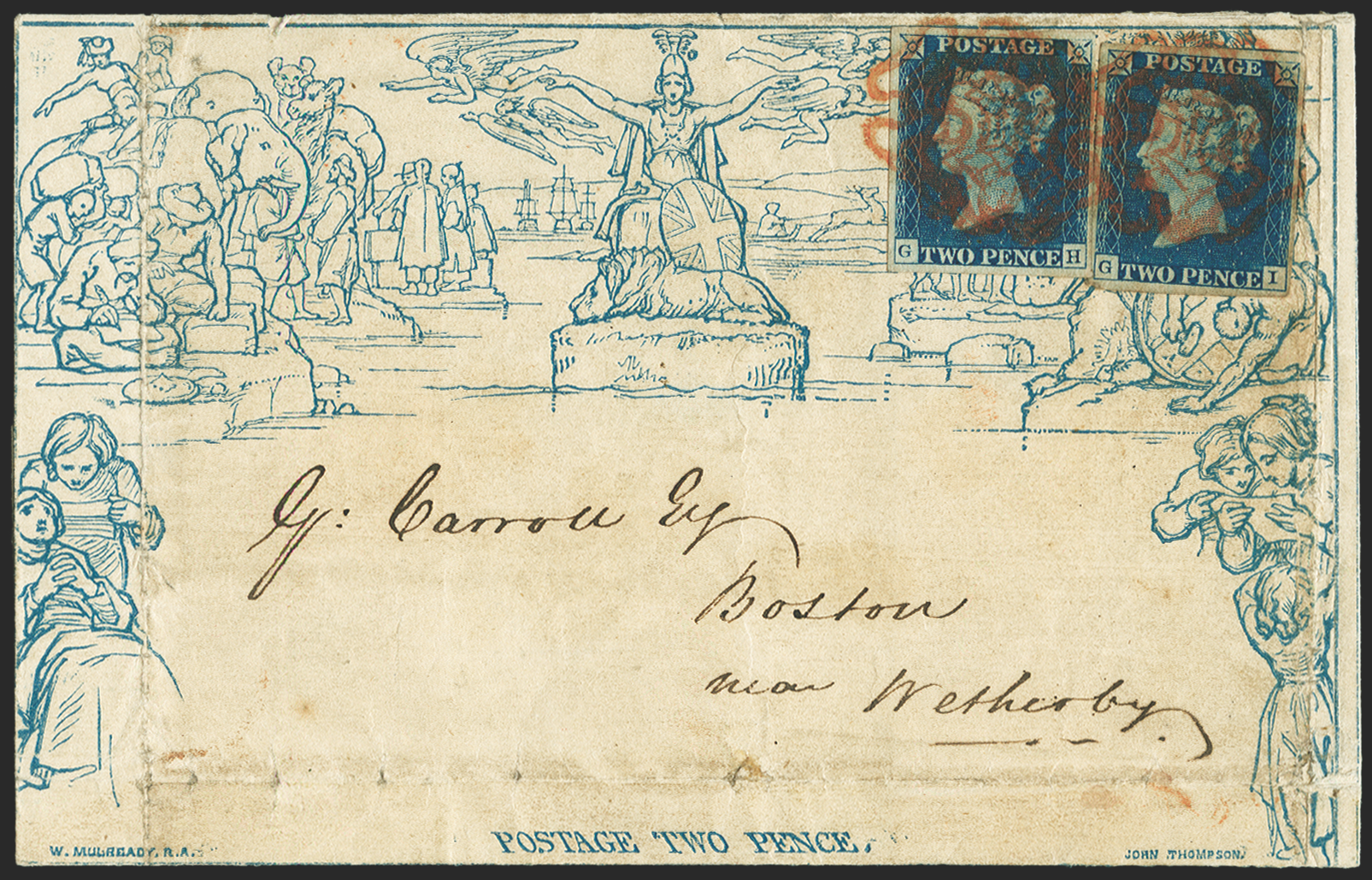 A very rare uprated Mulready, believed to be one of only two such 6d frankings uprated with 2d blues and the finest of the two existing examples. A major rarity of early British postal history.