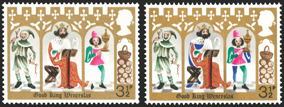 Very fine unmounted mint, with full original gum, example with blue (legs, robes) omitted. Offered with normal for comparison.
