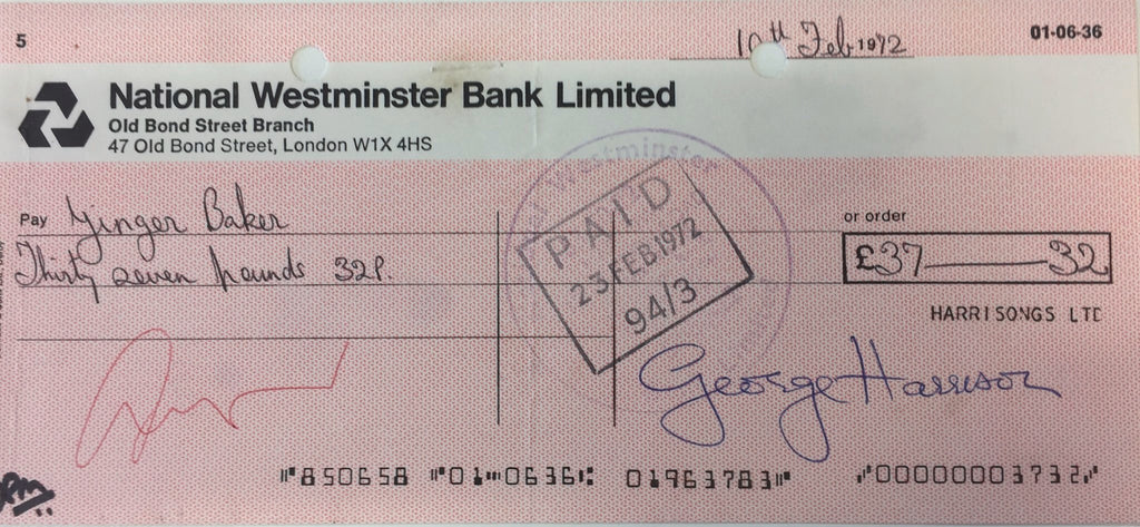 - A George Harrison signed cheque dated 1972 and made out to legendary Cream drummer Ginger Baker