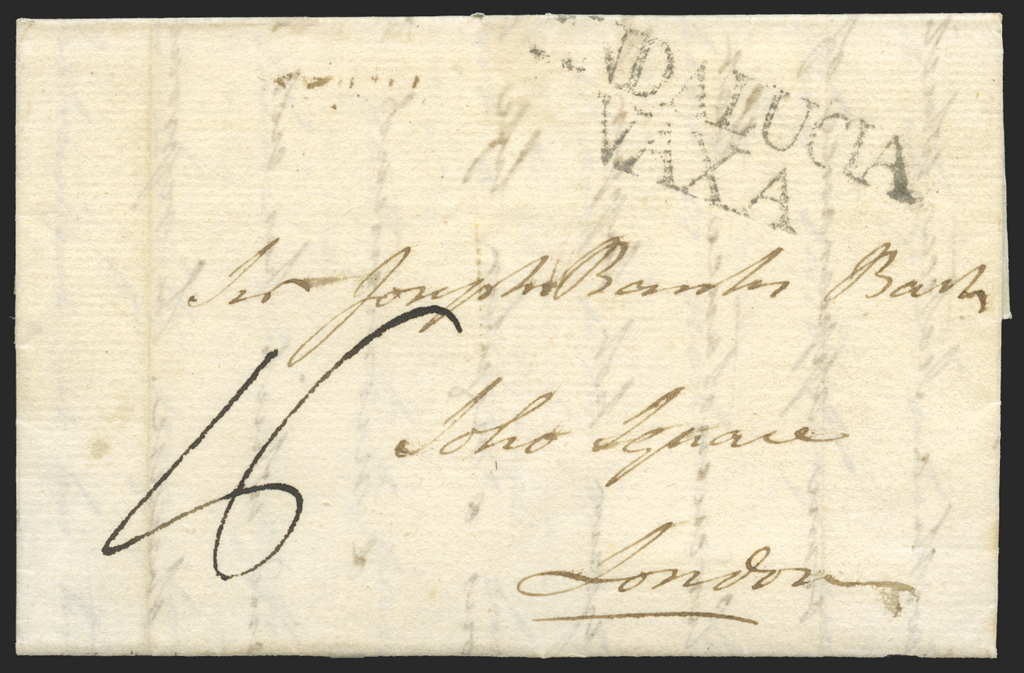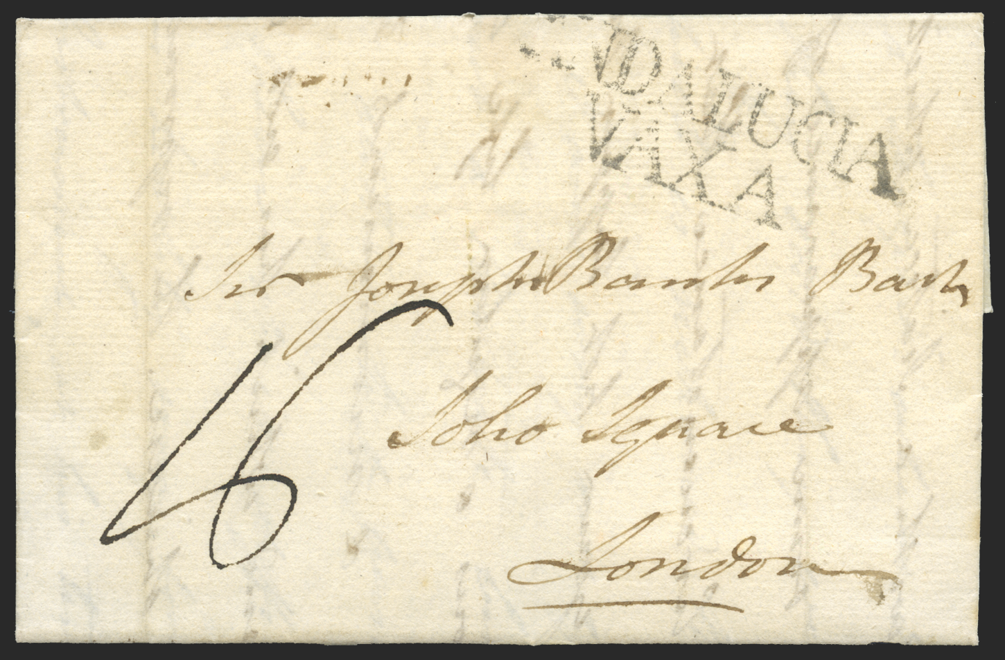 Gibraltar 1786 (24 Sep) entire letter from Gibraltar, addressed to the famous naturalist Sir Joseph Banks [then president of The Royal Society], London, sent by the Spanish overland route, with a fine strike of the rare "ANDALUCIA/VAXA" handstamp in black on face.