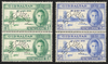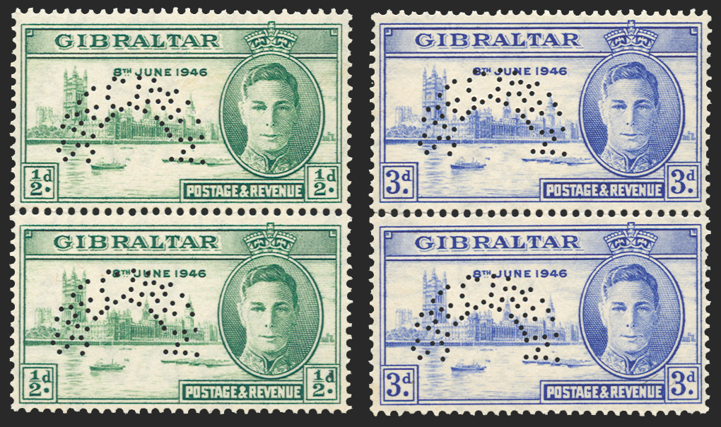 Gibraltar 1946 Victory ½d green and 3d ultramarine, perforated 'SPECIMEN' (type D21), VERTICAL PAIRS, SG132s/3s.