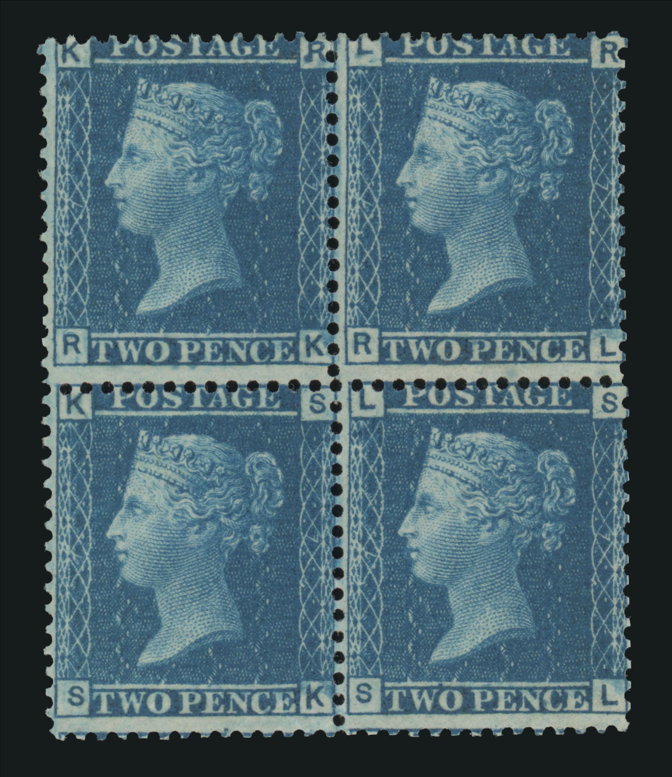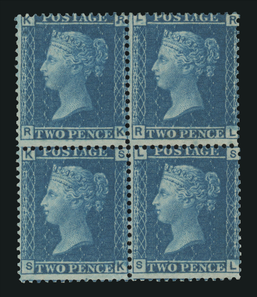A very fine unused original gum block of four of the 1858 2d blue, Plate 7, lettered 'RK' to 'SL'.