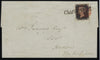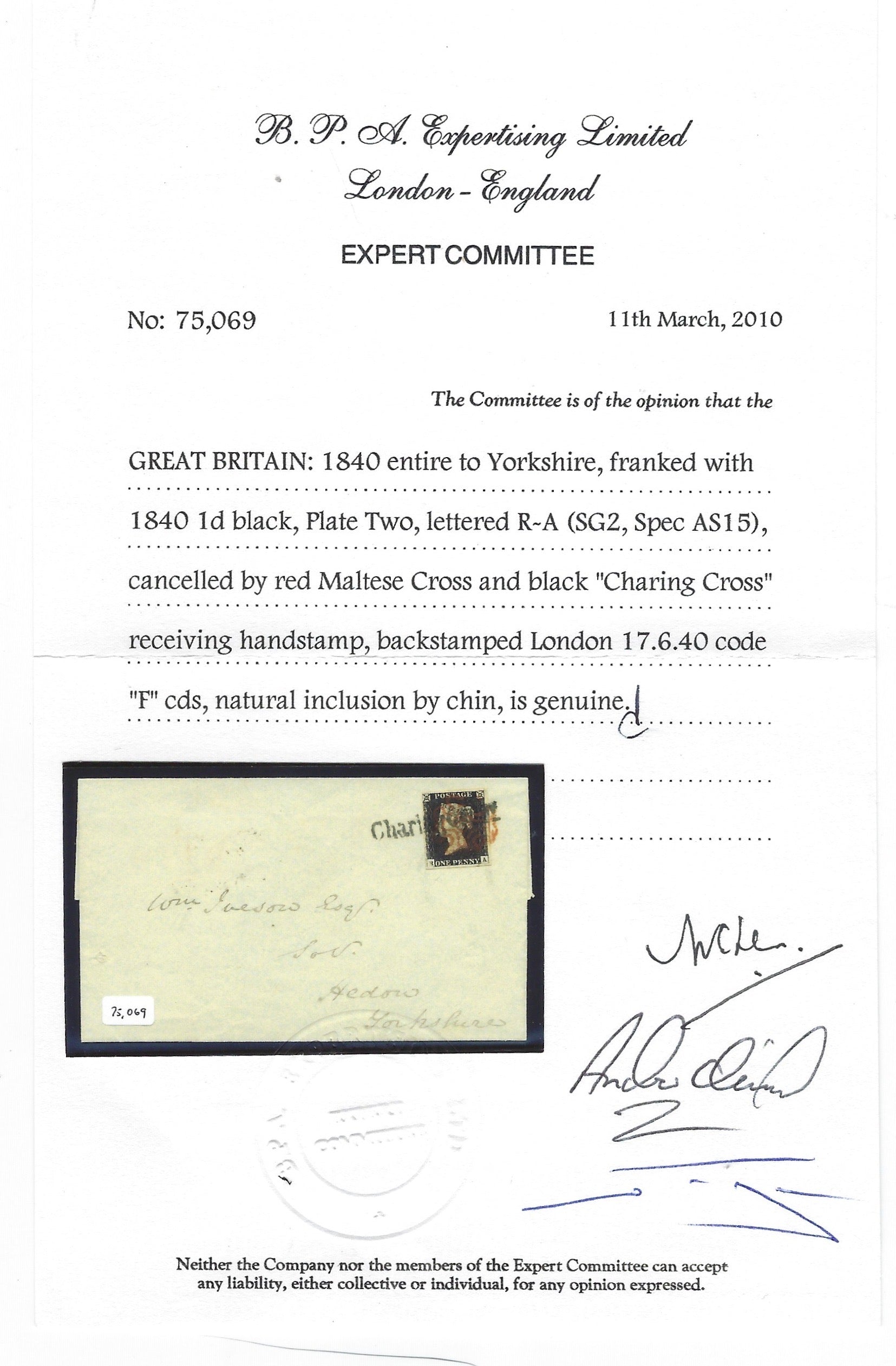 Great Britain 1840 1d Black PL2 SG2. Very fine wrapper sent from London to Hedon, Yorkshire bearing a close to large four margin example lettered RA, neatly tied by a red MC and a black "Charing Cross" receiving office handstamp. Backstamped by a London dispatched cds for JU.17.1841. Natural paper inclusion by chin nevertheless a wonderful example of this very rare cancellation used on cover accompanied by a 2010 BPA Certificate. Spec. AS15ya.