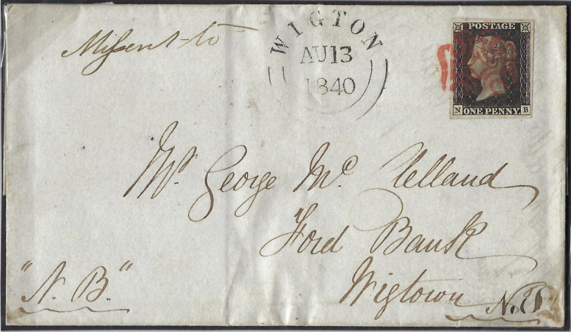 A very fine entire penny black cover sent from Manchester to Wigtown bearing a good to large four margin example lettered NB neatly tied by a red Maltese Cross, endorsed at top left in manuscript 'MISSENT TO' with a Wigton circular dated stamp alongside for AU.13.1840. Backstamped by a Manchester dispatch circular date stamp for AU.12.1840.