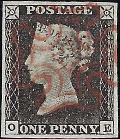 A very fine used four margin example from the first printing plate, lettered ‘OE’ and showing moderate plate wear, neatly cancelled by a crisp upright red Maltese Cross.