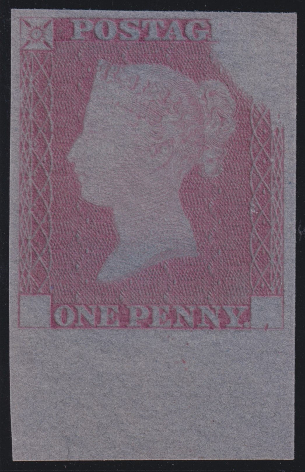 A very fine unused bottom marginal example printed in lilac pink on white wove paper dipped in prussiate of potash.
