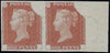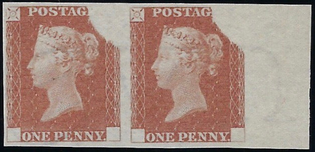 Very fine imperforate four margin right hand marginal horizontal pair printed in red brown on white wove paper showing part of the papermaker's watermark.