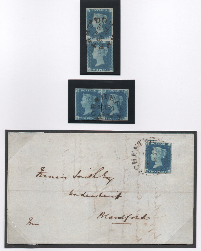 Great Britain 1840 2d. Blue Plate 2, SG5. The superb ‘vertical’ and ‘horizontal’ ”pairs” together with the unique cover, all cancelled by the circular date stamp of "Dorchester”. A totally unique page and fantastic showpiece of the two penny blue. Accompanied by a certificate of authenticity from the British Philatelic Association (BPA).