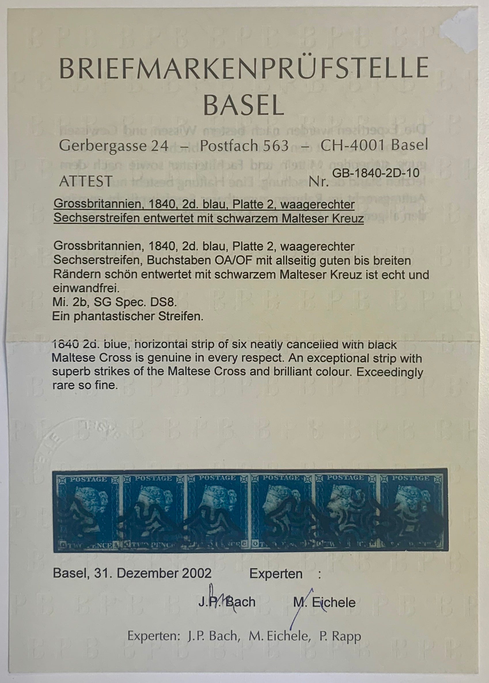 A very fine used close to very large four margin horizontal strip of six lettered OA-OF, each stamp neatly cancelled by a crisp black Maltese Cross.