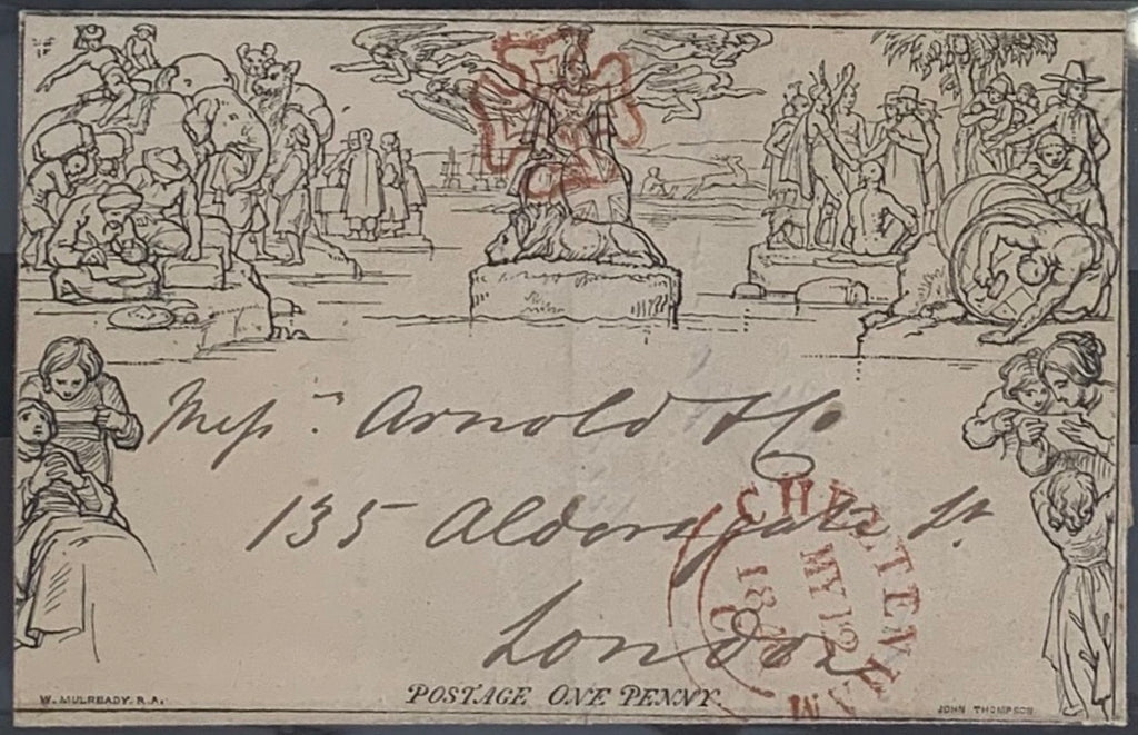 Great Britain 1840 - May 12th 1d Mulready Letter Sheet from CHELTENHAM to LONDON. Cancelled by red Maltese Cross and bearing a red Cheltenham circular date stamp for MY.12.40 "code 'C' on the reverse, London circular date stamp for 13th MV. 1840 code 'G' in red Letter Sheet :- Forme 3, stereo A63 first week of postage.