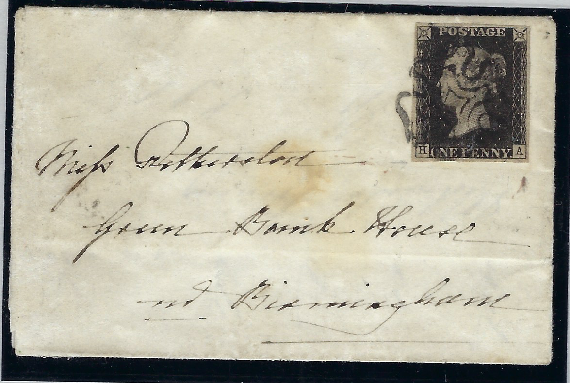 A very fine used four margin example lettered HA, neatly tied to a small entire envelope by a crisp black Maltese Cross, sent from Warwick to Birmingham and backstamped for AP.29.1841.