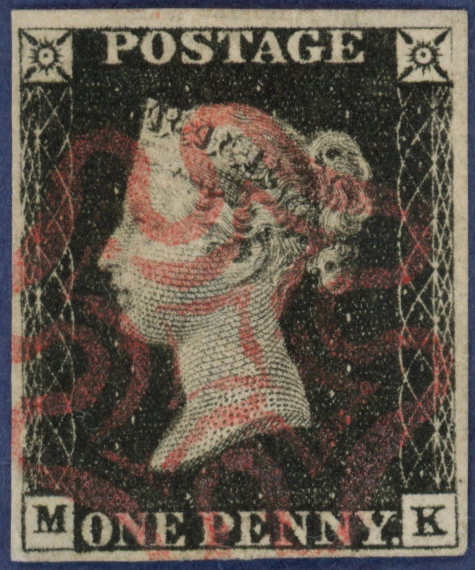 A very fine used four margin example lettered 'MK', neatly cancelled by a crisp red Maltese Cross.