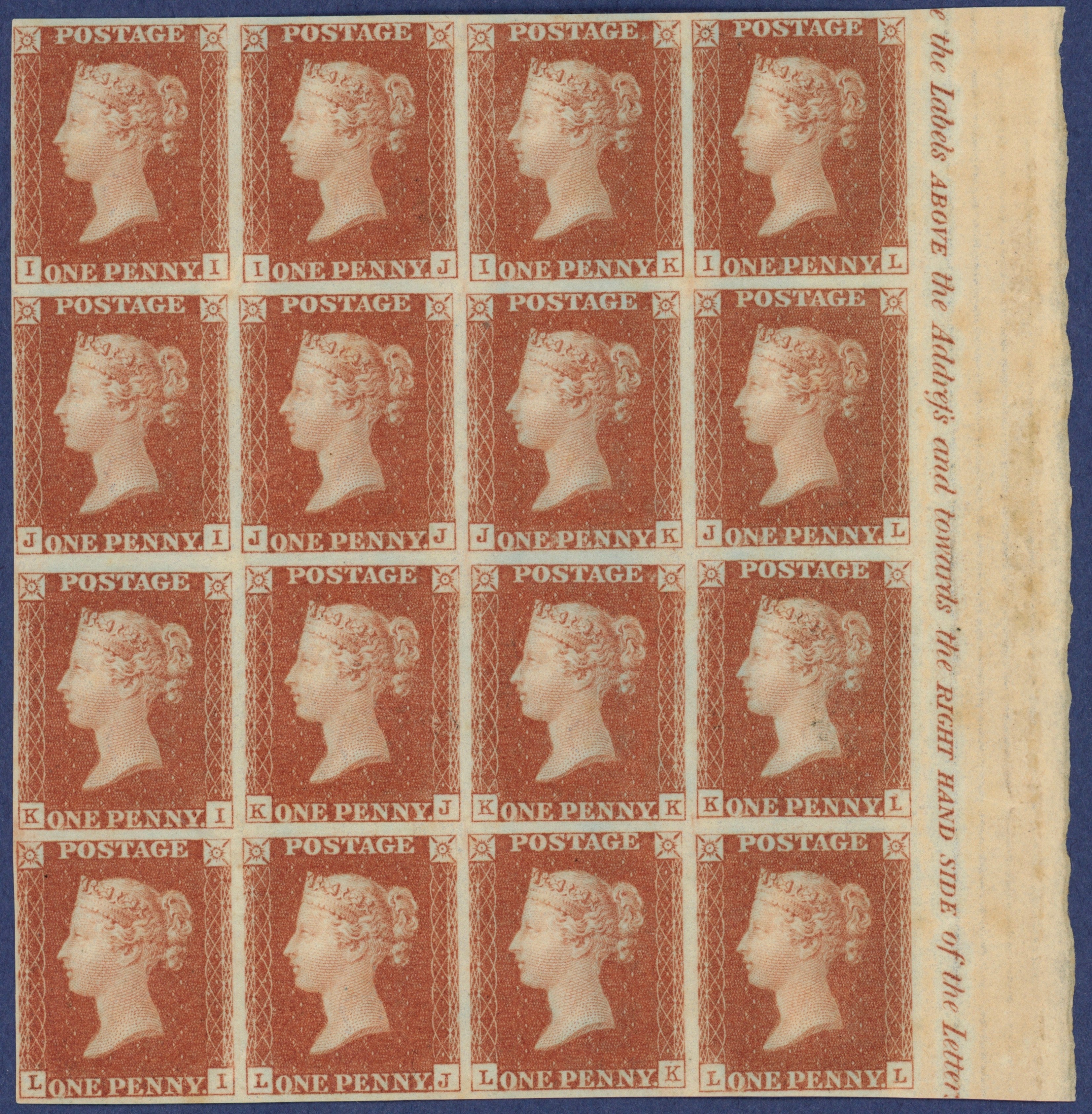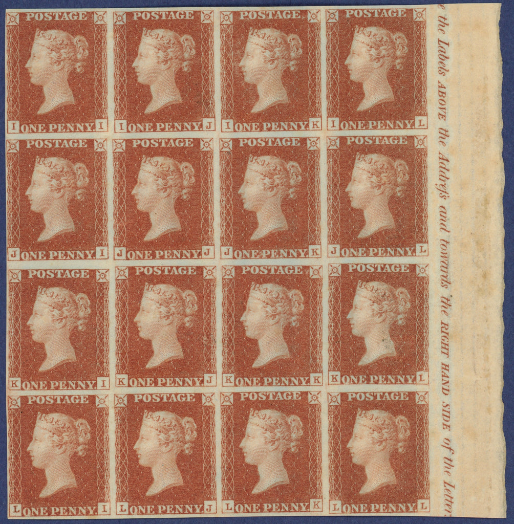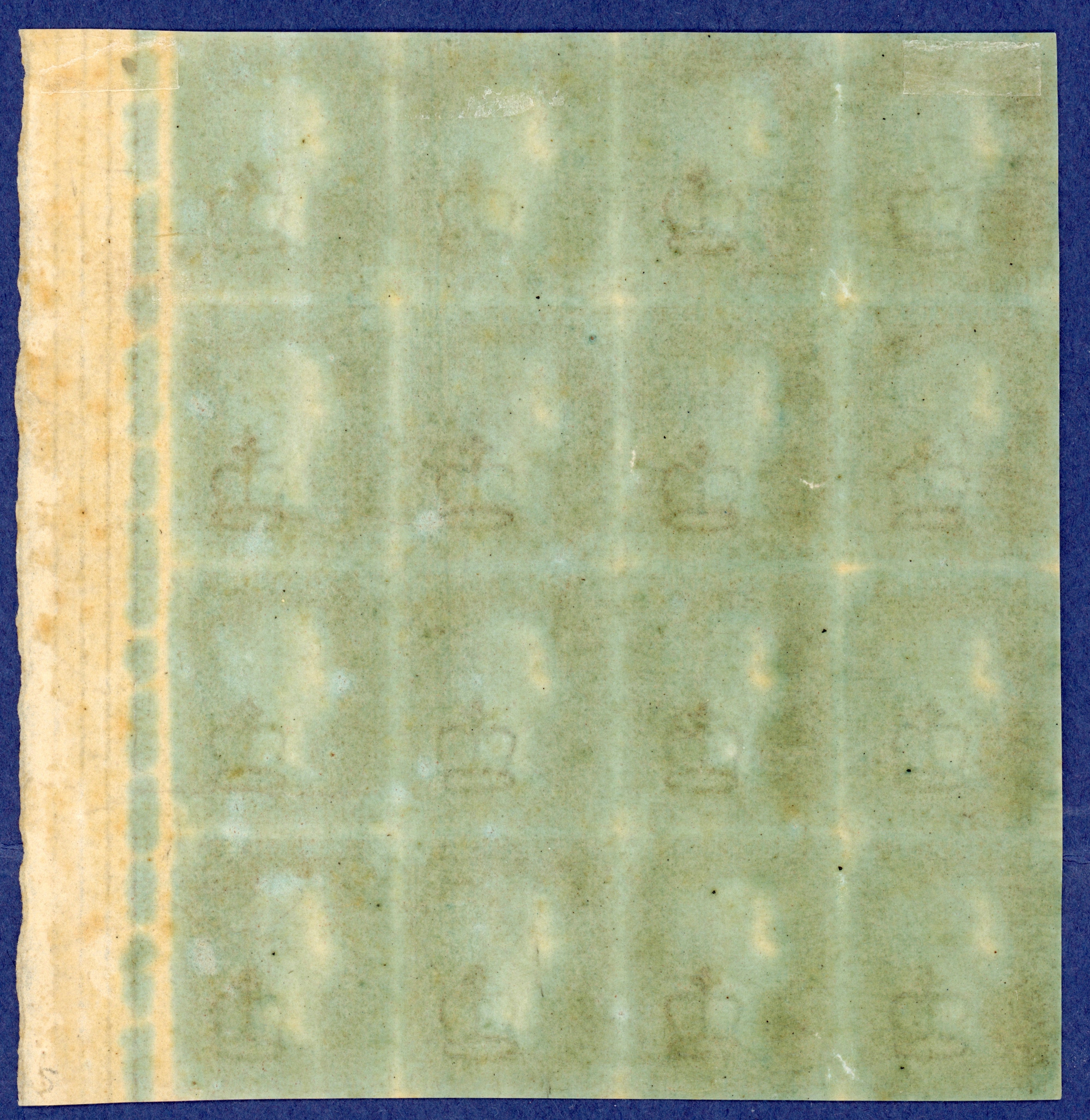 A superb unused, with original gum, four margin right hand marginal block of sixteen lettered 'II-LL', with full deckle edge selvedge and sheet marginal inscription.