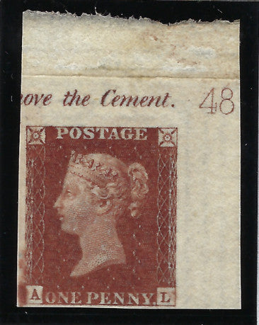 A superb unused top right hand corner marginal imperforate imprimatur lettered AL, showing part sheet inscription and plate number "48".