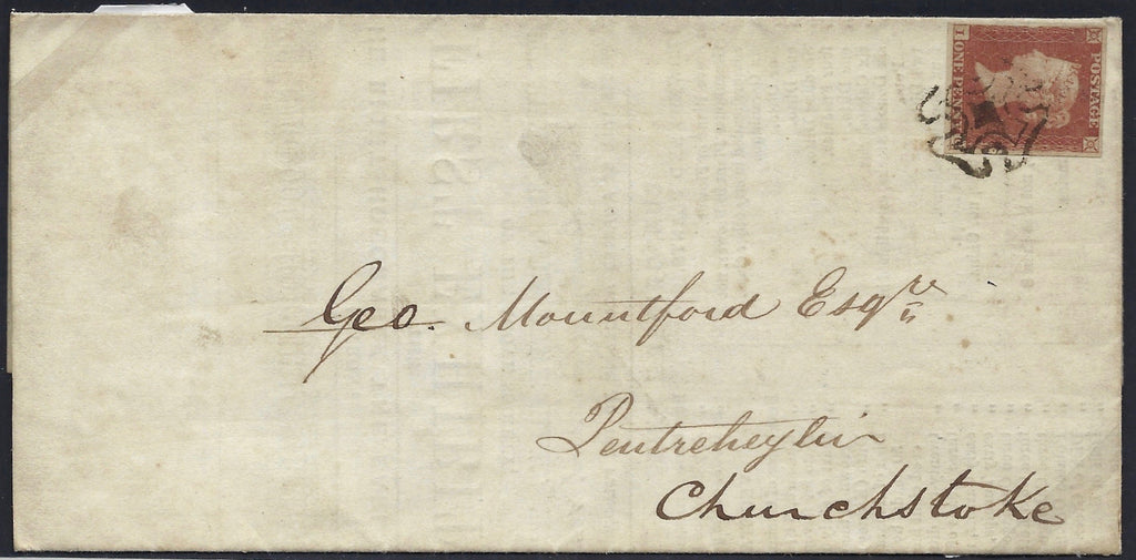 A very fine used good to large four margin example lettered IG, neatly tied to a printed entire by a distinctive Welshpool Maltese Cross, sent from Welshpool to Churchstoke and backstamped accordingly by a Welshpool dispatch datestamp for UJ.2.1842.