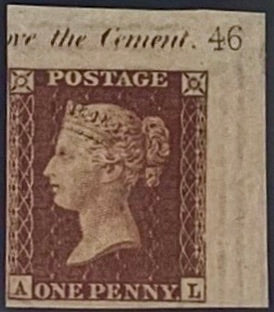 Very fine unused clear to large four margin top right hand corner marginal imperforate imprimatur lettered AL, showing part sheet inscription and plate number "46".