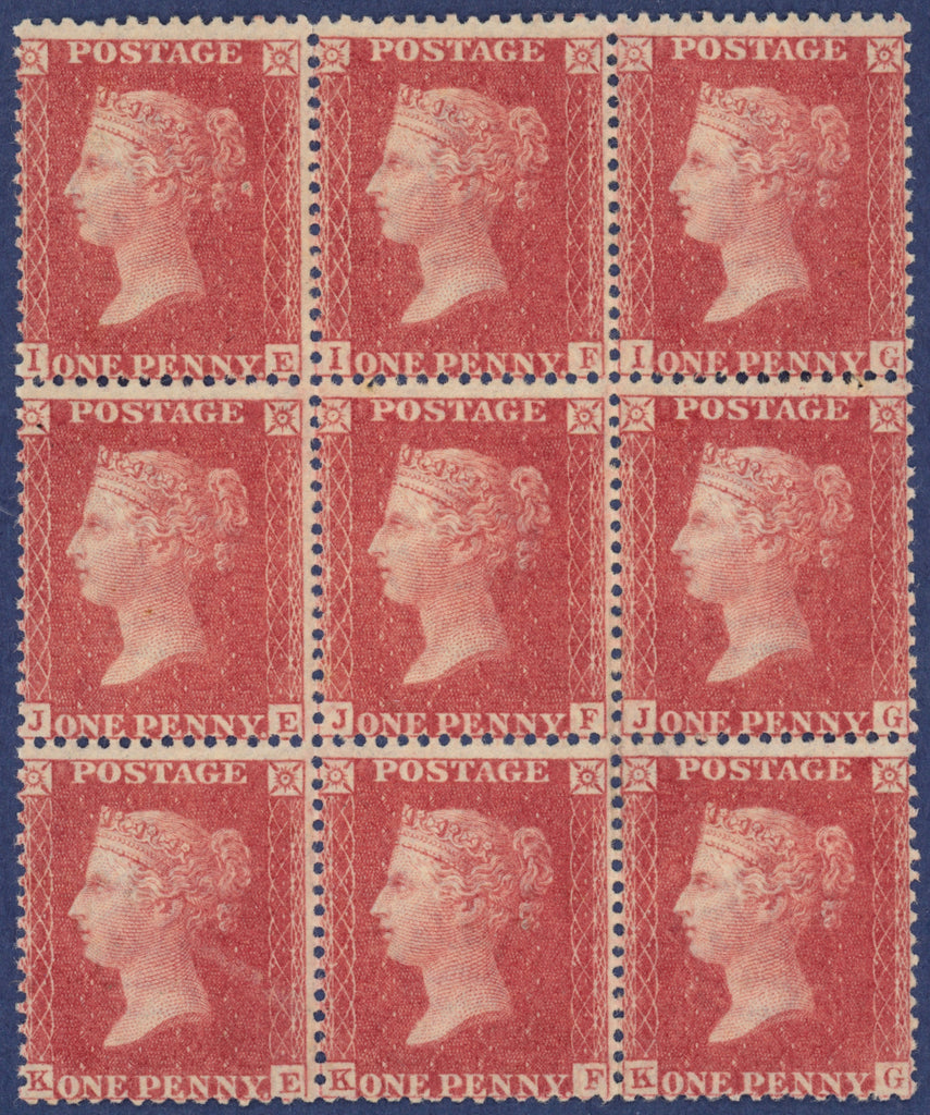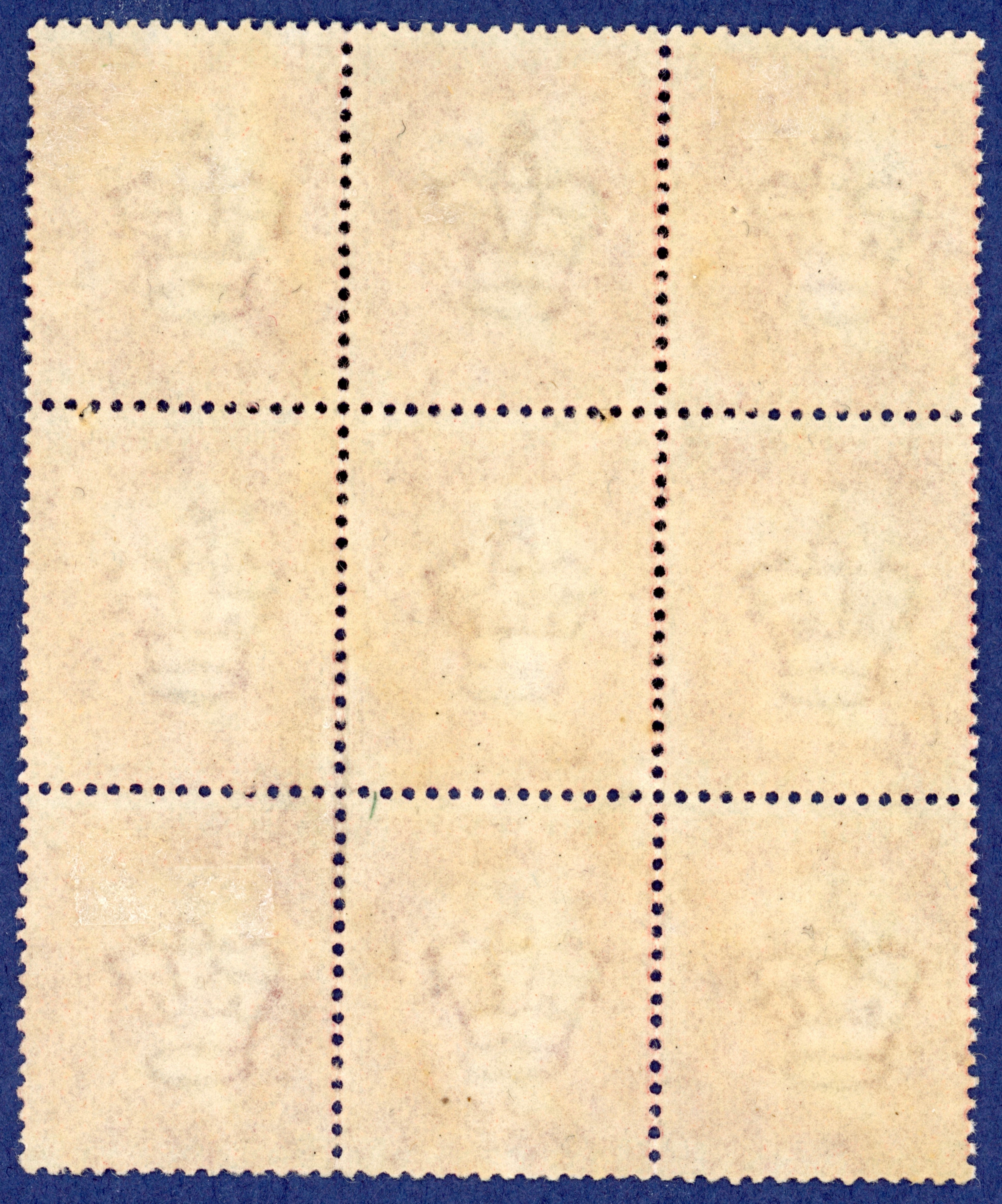 A very fine and fresh unused block of nine, with original gum, lettered 'IE-KG'.