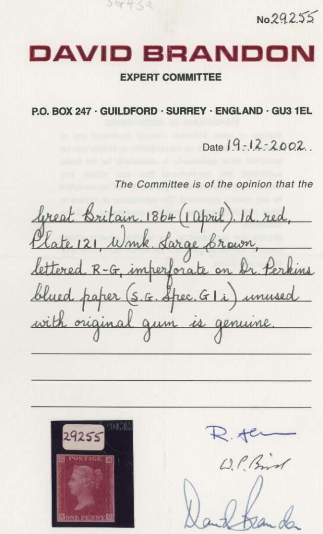 A superb unused, with original gum, imperforate example lettered 'RG', printed on Dr. Perkins "blued" security paper.
