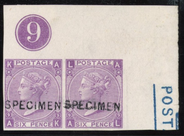 Great Britain 1870 6d Mauve Plate 9, SG109var – “SPECIMEN” Overprint