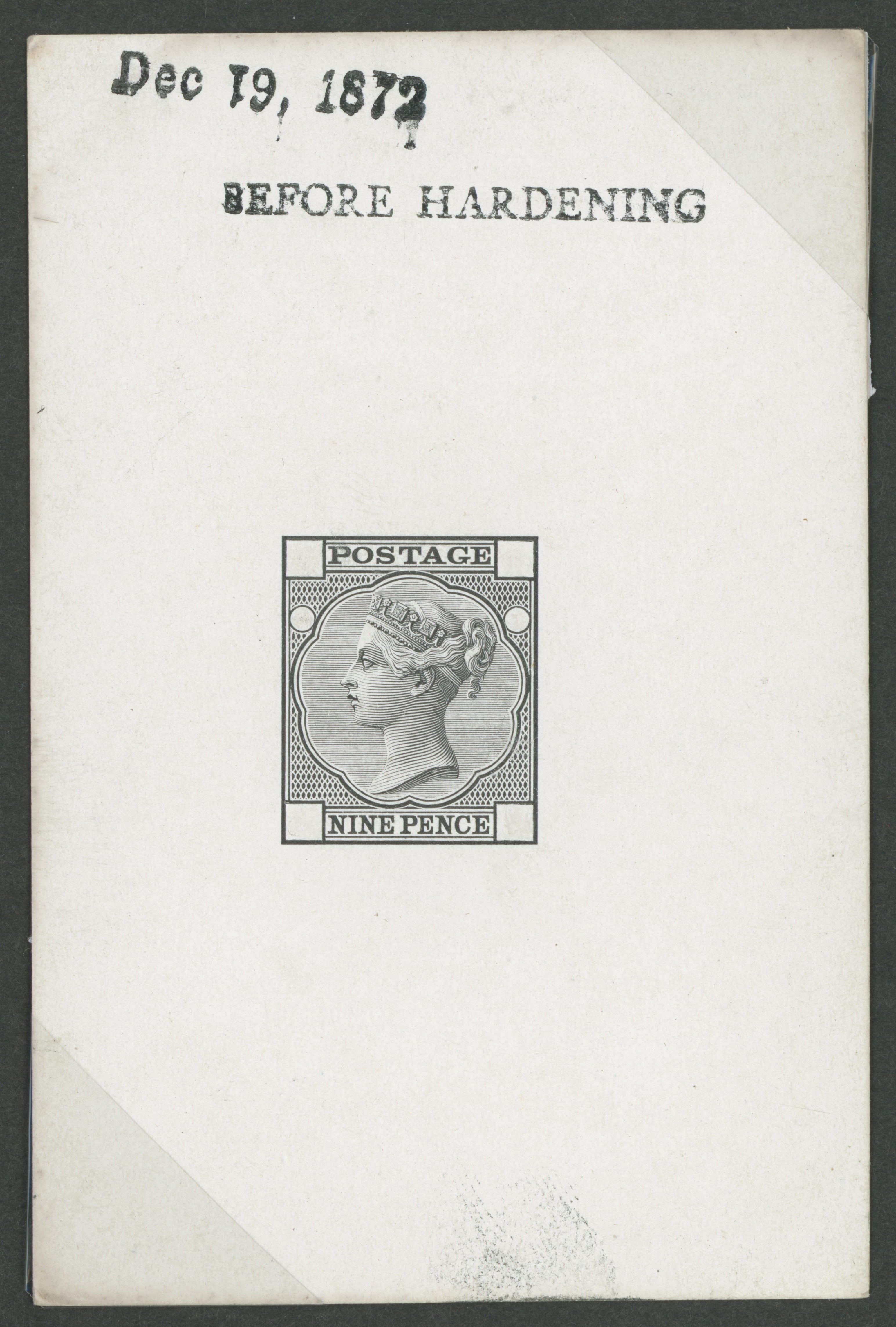 Die proof for the proposed design with coloured corner letters. The die was never used as this value was withdrawn.