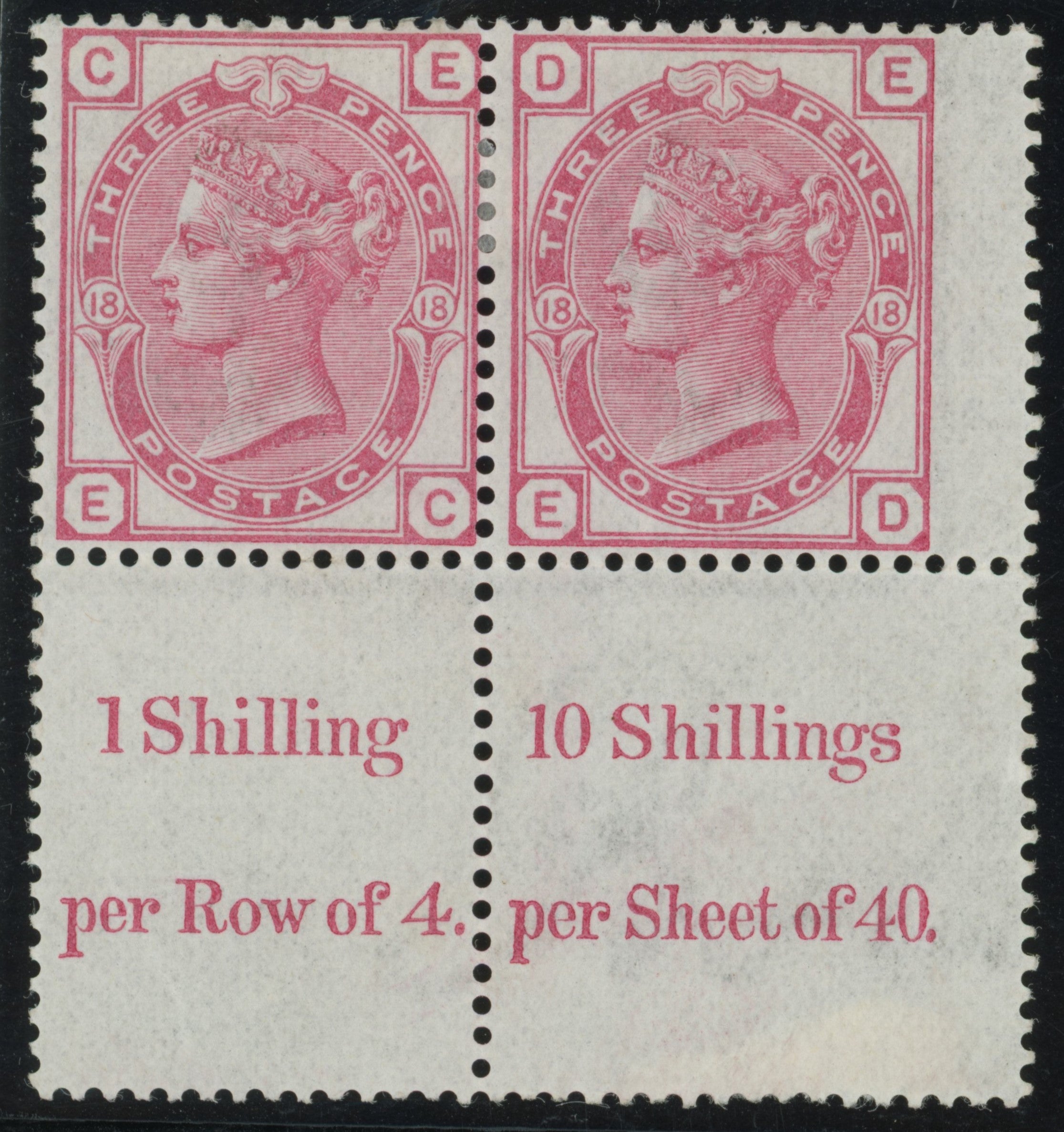 A very fine and fresh unused, with original gum, horizontal pair lettered 'EC-ED'. With sheet margin and inscription "1 Shilling per Row of 4/10 Shillings per Sheet of 40” at base.