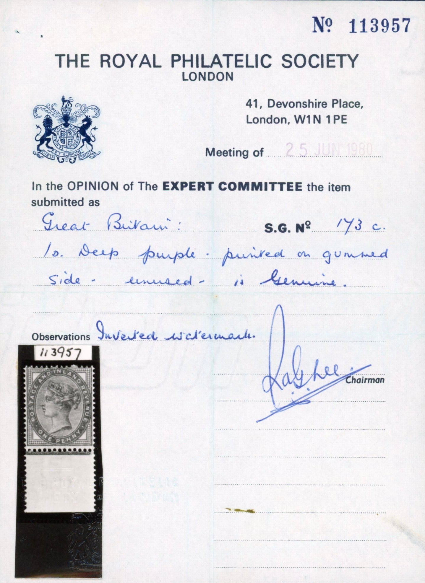Accompanied with a 1980 Royal Philatelic Society (RPS) Certificate of Authenticity.