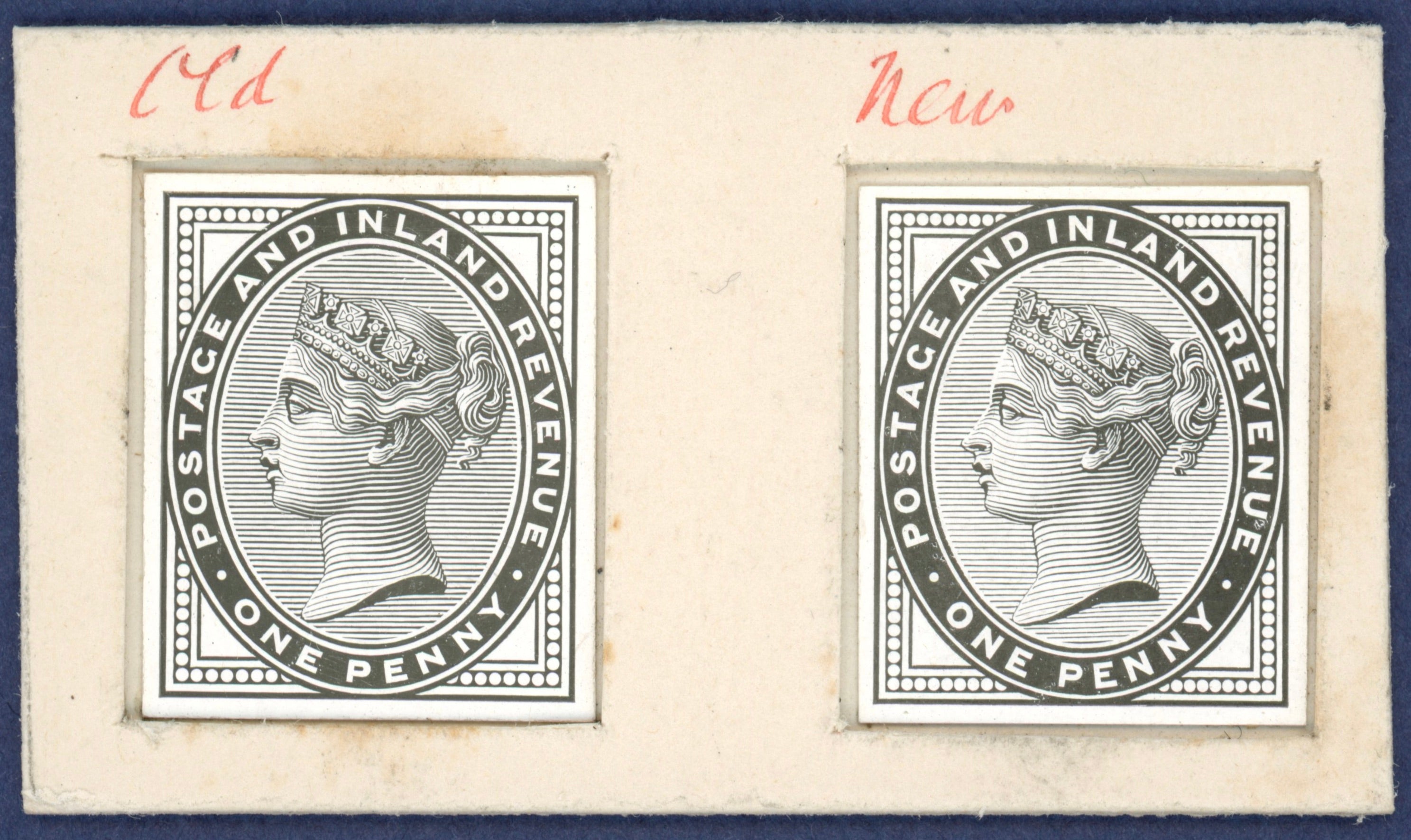 Very fine pair of die proofs proposed for the 1881 1d lilac, printed in black on cut down white glazed card and mounted in a sunken frame. Endorsed at top "Old" & "New" in red manuscript.