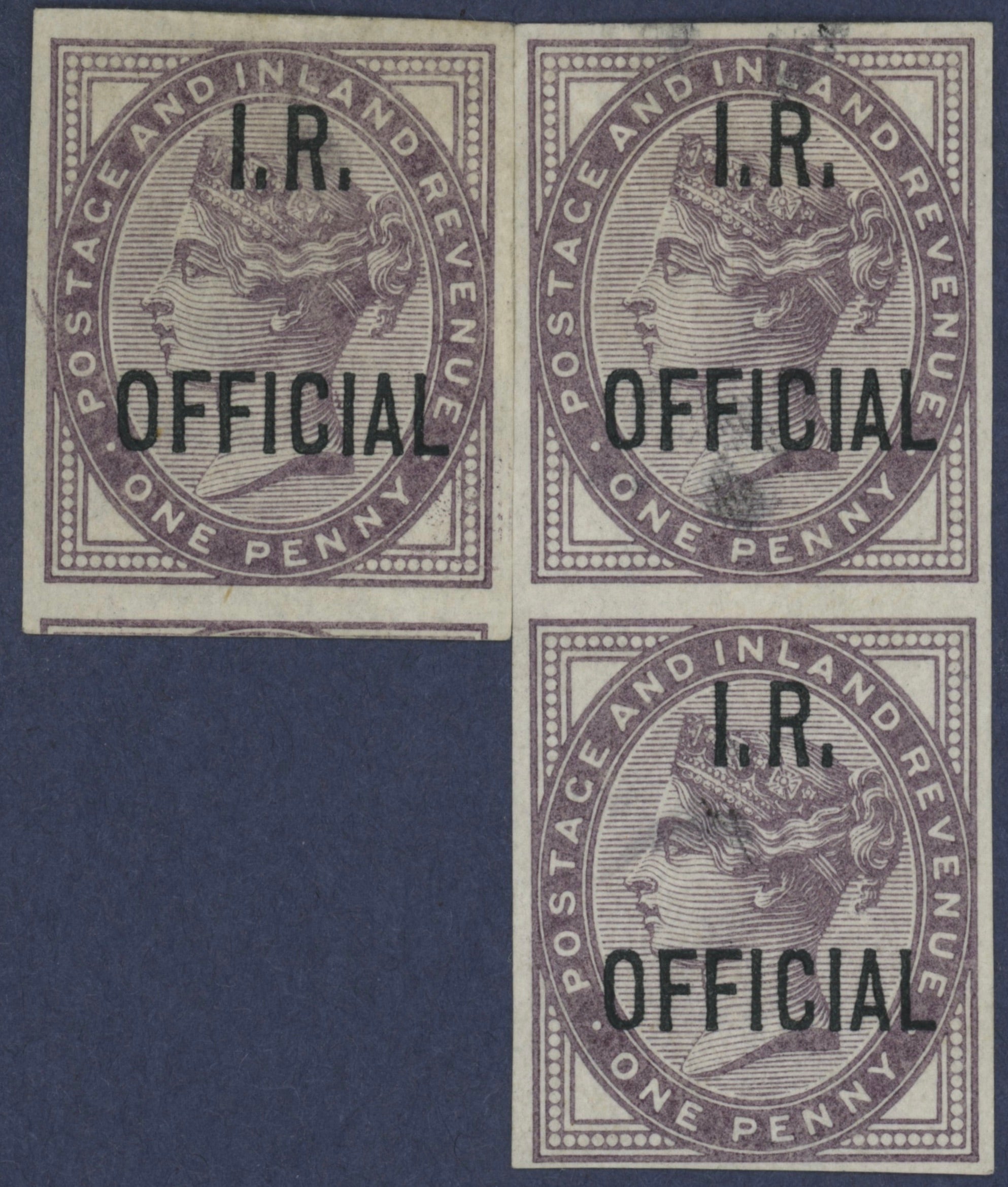 The vertical pair was formerly erroneously listed in the Stanley Gibbons GB specialised catalogue as L3f - "Imperforate without watermark". There is infact a light, very misplaced watermark. It is to be listed in the next specialised catalogue as L3f "Imperforate with blue-black overprint". and is now included in the Stanley Gibbons GB Concise catalogue as SGO3ca.