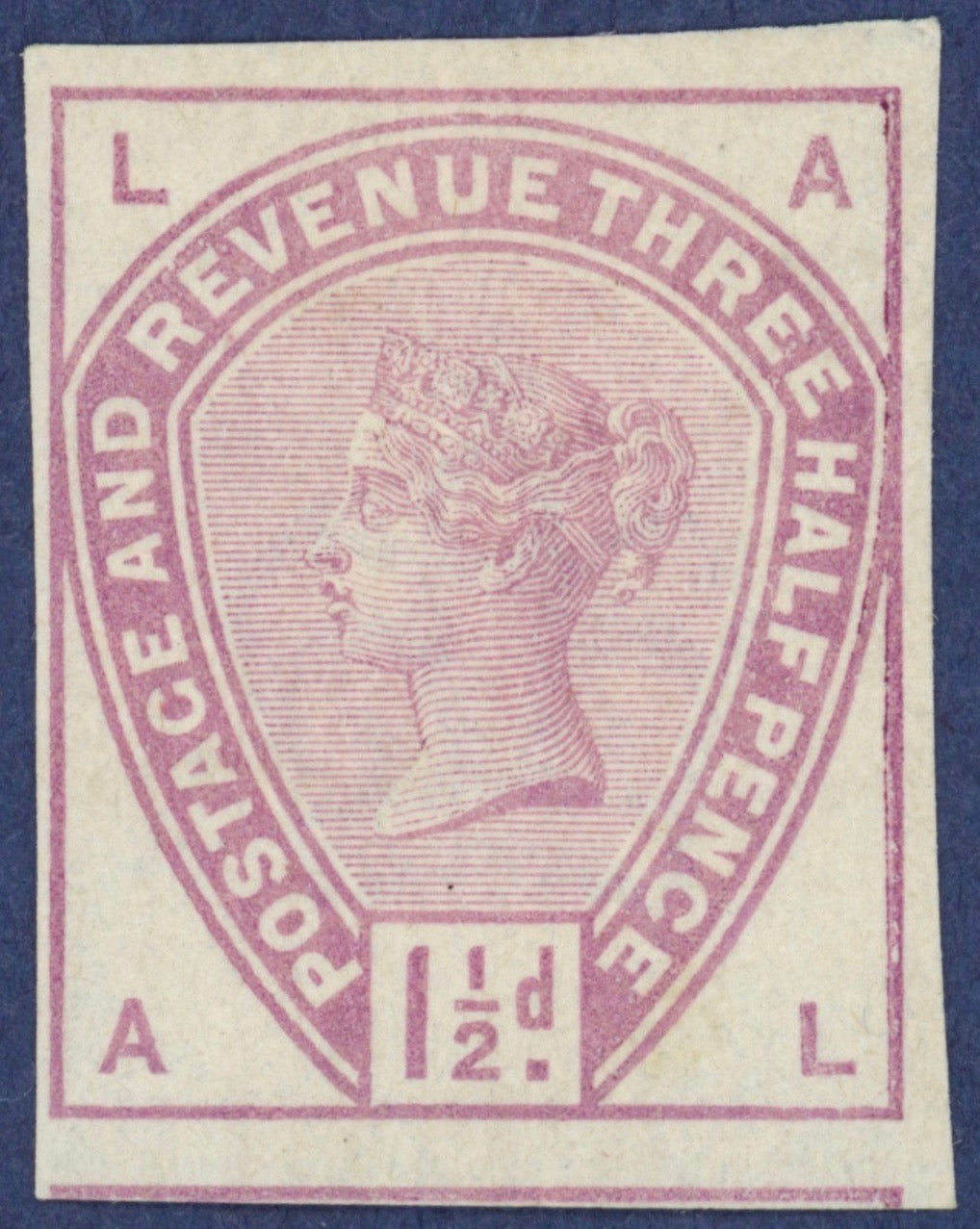 A very fine imperforate example printed on white gummed Crown watermarked paper in bright mauve lettered 'AL'.